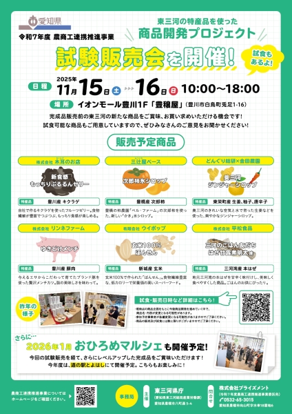 一部の開発中商品は、11月15日(土)、16日(日)にイオンモール豊川の豊穣屋で開催する試験販売会にて試食と販売を行います。また、完成商品は1月に開催予定の販売会にてお披露目される予定です。ぜひ、ご期待ください!