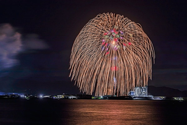 蒲郡の花火大会は竹島桟橋付近から見物することが多いのですが、鉄道利用ですと帰りの混雑が大変。鉄道を使っても少し離れたところから見物すれば、帰りの混雑に巻き込まれなくて済むかもしれないと思って形原町の海岸から見物しました。少し距離はあっても、三尺玉はさすがに大きく見事でした。
