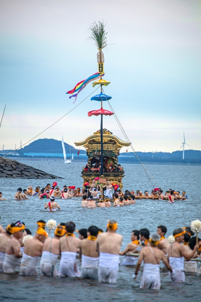 昨年は潮位が高くて中止になった海中渡御、今年は絶対に見ようと思って待ちに待ちました。風もなく寒くもない穏やかな天候に恵まれ海中渡御も無事終了。三谷祭りの神幸祭を一日楽しませていただきました。