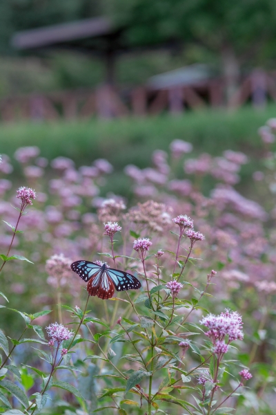朱色の太鼓橋の手前には、立派な紫陽花が満開に咲き誇っています。