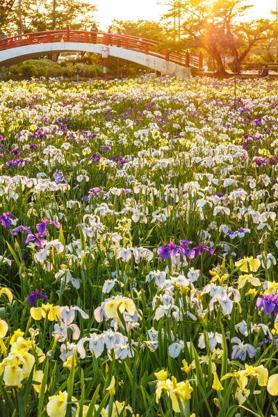 菖蒲の淡い色合いと夕景はとても相性がいいと思ってこの時間を狙いました。陽が落ちる直前、オレンジの光が差し込み菖蒲を照らしてくれました。