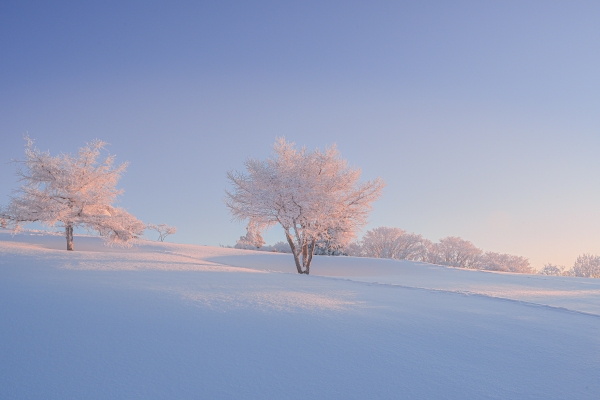 夜明けの淡い光に包まれ、雪原に立つ樹氷がほのかに桃色へ染まる、静寂と温もりが同居する冬景色のひととき。