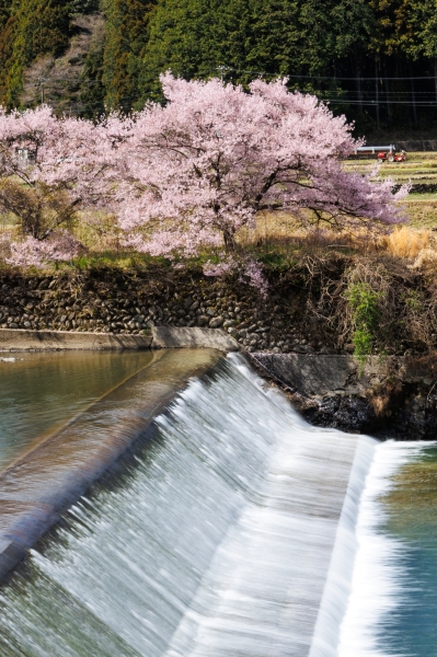 巴川沿いを車で運転していたら偶然にも絹のような水流の対岸に満開の桜。遠くには田植えの準備を始めているトラクターと山里に春の訪れを感じました。