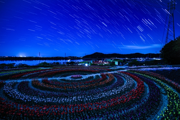 幾何学模様に咲く満開のチューリップと星の軌跡を長秒露光で写して宇宙と交信しているイメージで撮りました。秘密基地に自分がいるような神秘的な夜でした。