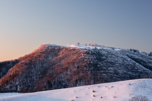 茶臼山の樹氷が朝日に照らされて赤く染まるとき、マイナス10℃の寒さを忘れるほど美しい世界が広がります。