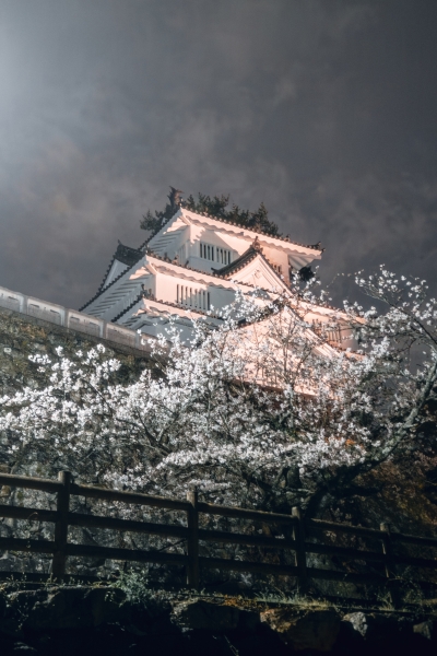 少しだけ雨が降りしっとりした空気の中、夜桜とライトアップされた吉田城の見事なコラボレーションでした。