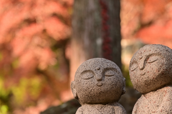 普門寺の紅葉、お二人のお地蔵さんがご挨拶。