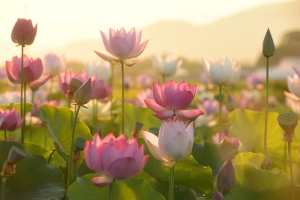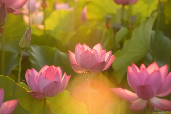 7月の早朝朝日が当たる蓮池を望遠で撮影しました。