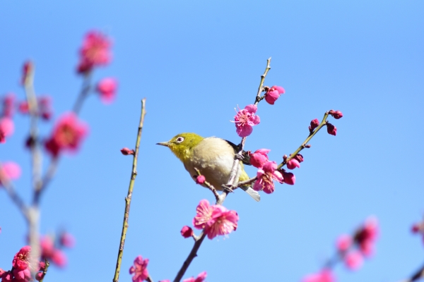 早春の梅園、メジロが花の蜜をついばみます。