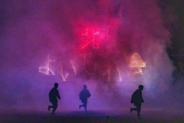 仕掛け花火の前を横切る3人がまるであの有名な窃盗団のようで微笑ましく思いました。