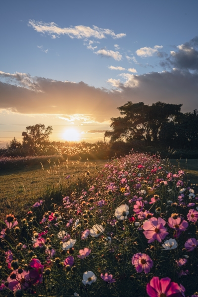 色とりどりの花菖蒲が咲き誇る水辺に、赤い橋が夕空に映える。人々のシルエットが静かに浮かび上がるその光景は、日常の喧騒を忘れさせるひととき。見事なうろこ雲と黄金から藍へと移ろう空のグラデーションが、初夏の終わりを優しく告げている。