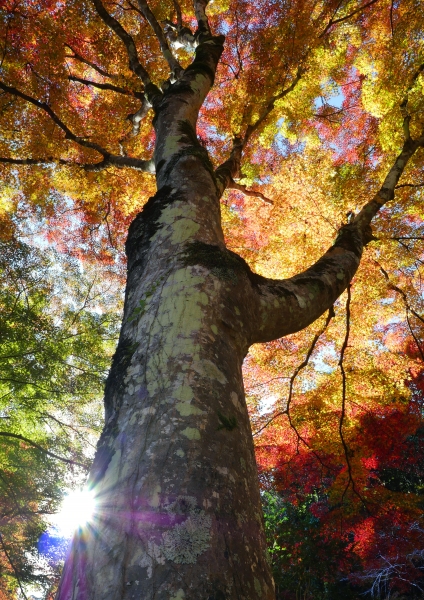 秋になると毎年県民の森に撮影に出かけます。この日は天気も良く紅葉も見頃で一日楽しく撮影ができました。一本の古い大木に太陽が降り注ぎ燦然と輝いていました。