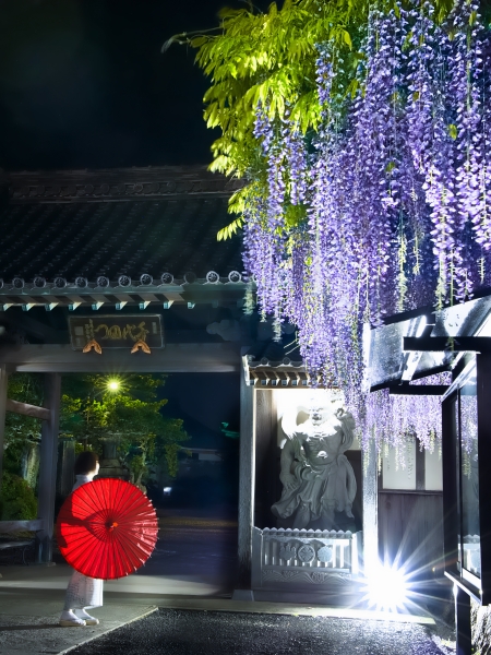 潮音寺の見事な藤。その下に広がるのは、時が止まったかのような幽玄な世界でした。鮮やかな赤傘が夜の闇に浮かび上がり、力強い仁王像に見守られながら、東三河の歴史と美しさが重なり合う瞬間を切り取りました。