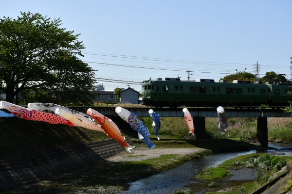 捨石川沿いを歩いてたら鯉のぼりが泳いでいました。タイミングよくイモムシ電車とやってきたので一緒に撮影しました。