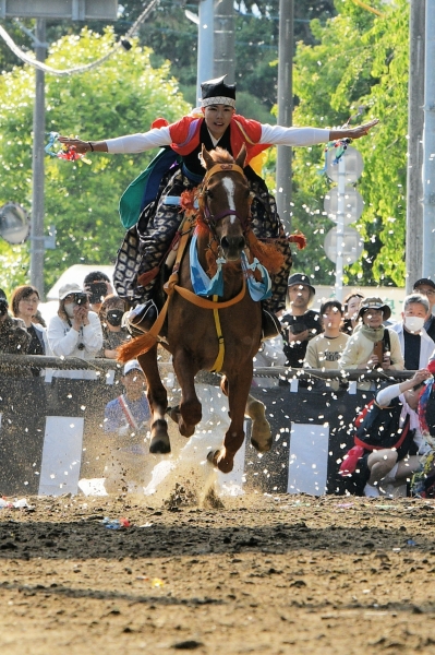 若武者に扮した青年が、紙吹雪を巻き上げ、目の前を堂々と走っていきました。