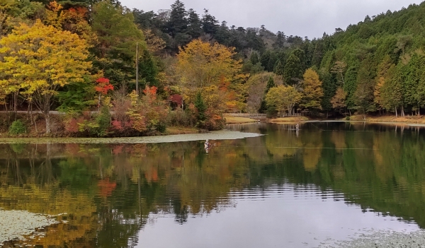 秋の段戸湖では美しい紅葉のなかフライフィッシングを楽しむ釣り人がいました。