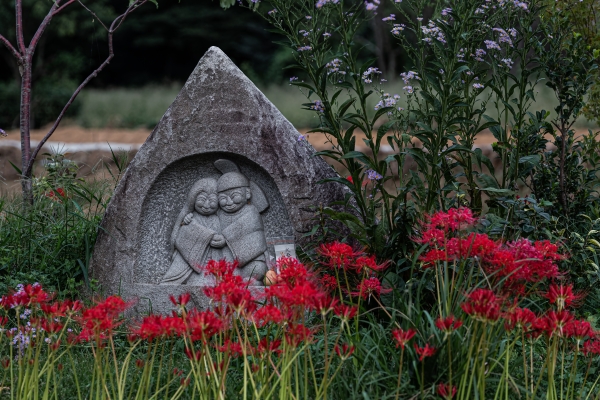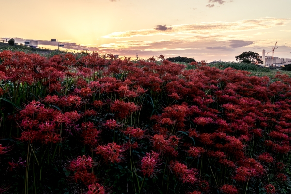 夕日に照らされて深紅の咲き乱れる彼岸花