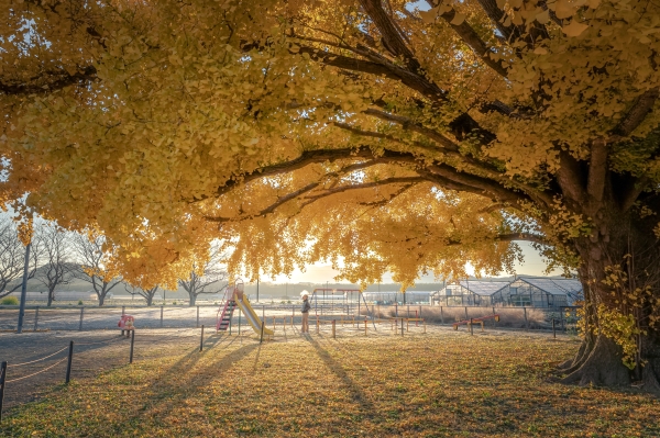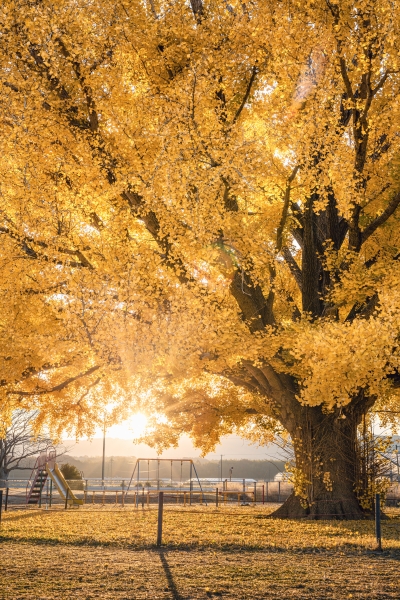 見頃を迎えた大銀杏に朝陽が暖かくふりそそぐ