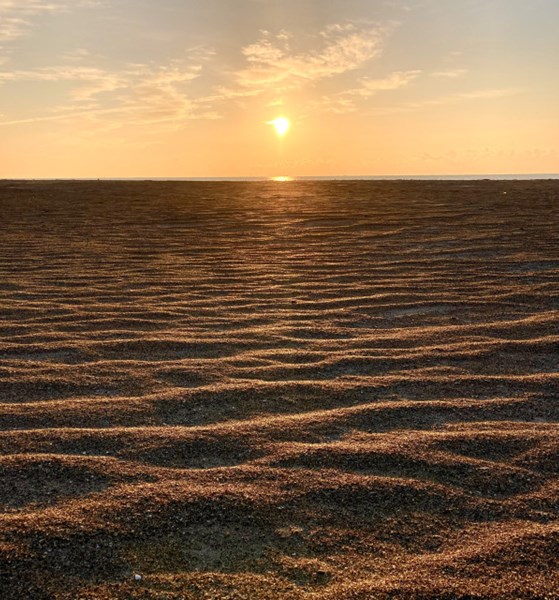 夜明けの太平洋ロングビーチ。朝陽に照らされて風紋が輝いていた。この砂浜よ、いつまでも。