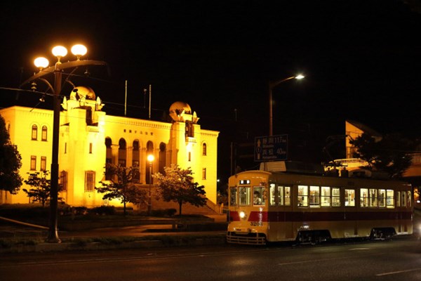 このモ3203号電車は例年ビール電車や花電車に装飾されて走りますが、今年は新型コロナウイルスの影響で中止となり、普段の姿で黙々と市民を運んでいました。夜のライトアップされた公会堂をバックに車に邪魔されず撮ることができました。