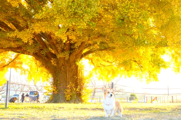 朝日が差し込む大イチョウと愛犬サンちゃんが輝いていました。