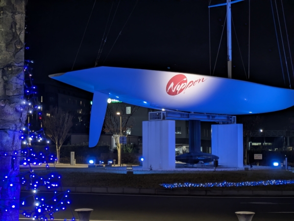 孫から駅前に青いヨットがライトアップされているとの情報で撮影です